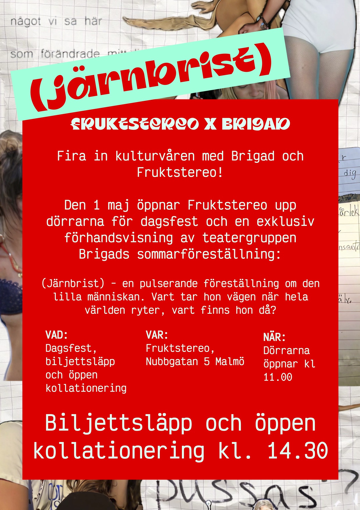 Brigad bjuder in dig till att vara en del av detta första smakprov, att tillsammans med oss möta de texter som föreställningen kommer ta avstamp i. Vi vill ge en inblick i processen att skapa teater och sommarens föreställning. Ge dig en exklusiv förhandstitt på vad som kommer ske på Fruktstero under (Järnbrist) sommaren 2026.